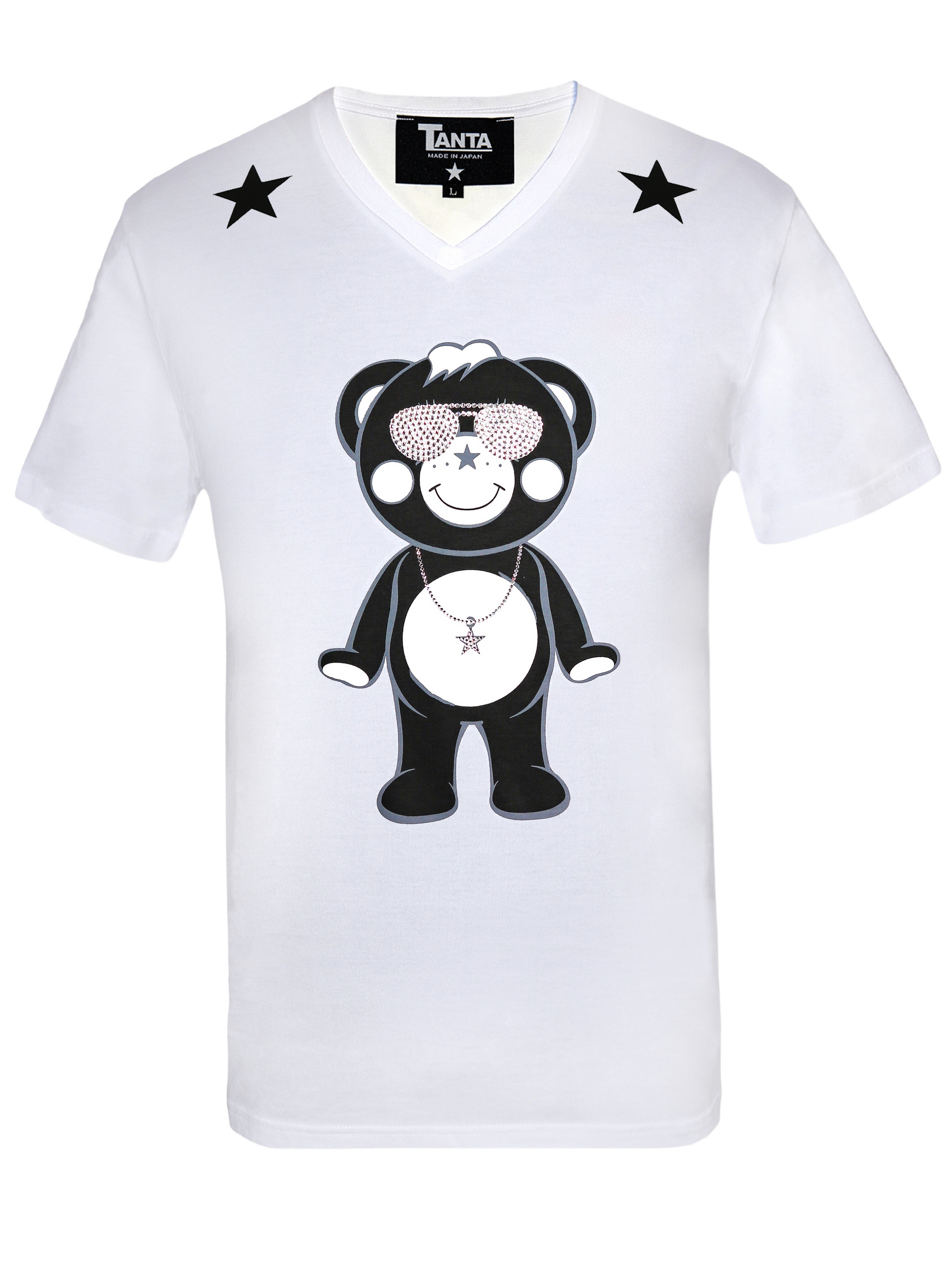 サングラスとネックレスには本物のスワロフスキーの輝くクリスタル💎が贅沢に施され、圧倒的な存在感を放ちます。さらに、フロントとバックにはスタイリッシュな★がアクセントを加えています。着心地の良さにもこだわり、伸縮性のある高級な100%コットン素材(PARVATI®)を使用しています。